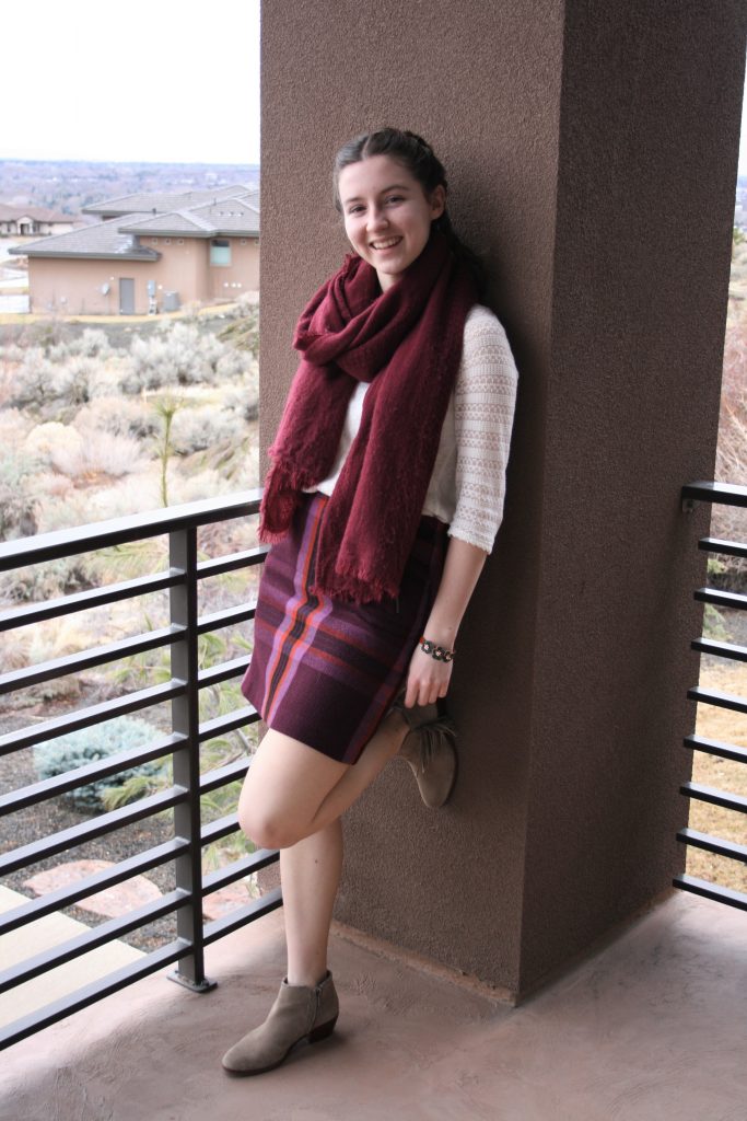 While not the best photos, I would wear this outfit again in a heartbeat. I love the color combo of burgundy, taupe, and crème for fall. I also think this plaid wool skirt is super cute and pairs perfectly with my big blanket scarf. Maybe this look seems really dated, but as I’ve established several times before, I’ve never been very trendy. Plaid skirts and blanket scarfs forever and ever. See more of the look here!