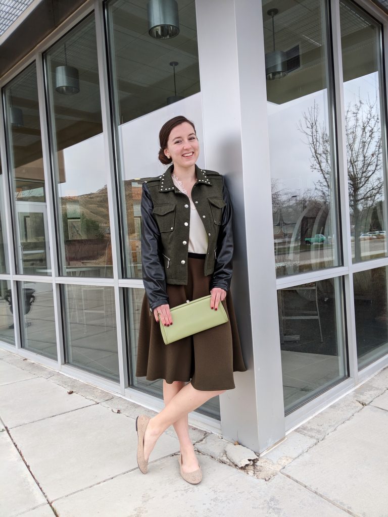 This outfit may not be the trendiness or something that most girls my age would gravitate towards, but I love the old-fashioned vibes. The crème lace blouse and olive midi skirt pair perfectly together, and the pleather military style jacket is a fun addition. I also think my light green clutch, which is truly vintage from my grandma, is the perfect accent color to the olive green. I would love to wear this outfit again and would probably only change the shoes—I think heels would be more flattering with the longer skirt. You can see more of this outfit in this post.