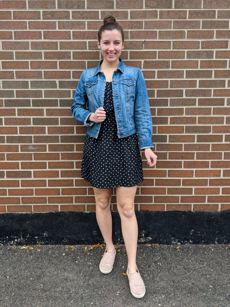 Heart-Print Dress: Hand-me-down, last worn here | Jean Jacket: JCPenney, $19, last worn here | Blush Sneakers: Steve Madden via DSW, $60, last worn here