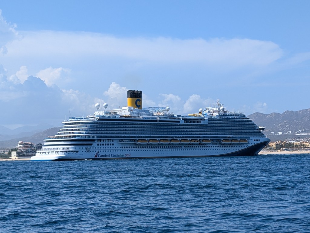 We did the 5-Day Mexican Riviera from Long Beach (Los Angeles), CA cruise on the Carnival Firenze, which is a new ship that only started cruising earlier this year—Italian themed (Firenze is the Italian word for Florence). We boarded the cruise on a Thursday, Friday was an “at sea” day, Saturday was our port day in Cabo San Lucas, Sunday was another at-sea day, and Monday was our second stop in Ensenada. The cruise ended on Tuesday morning.