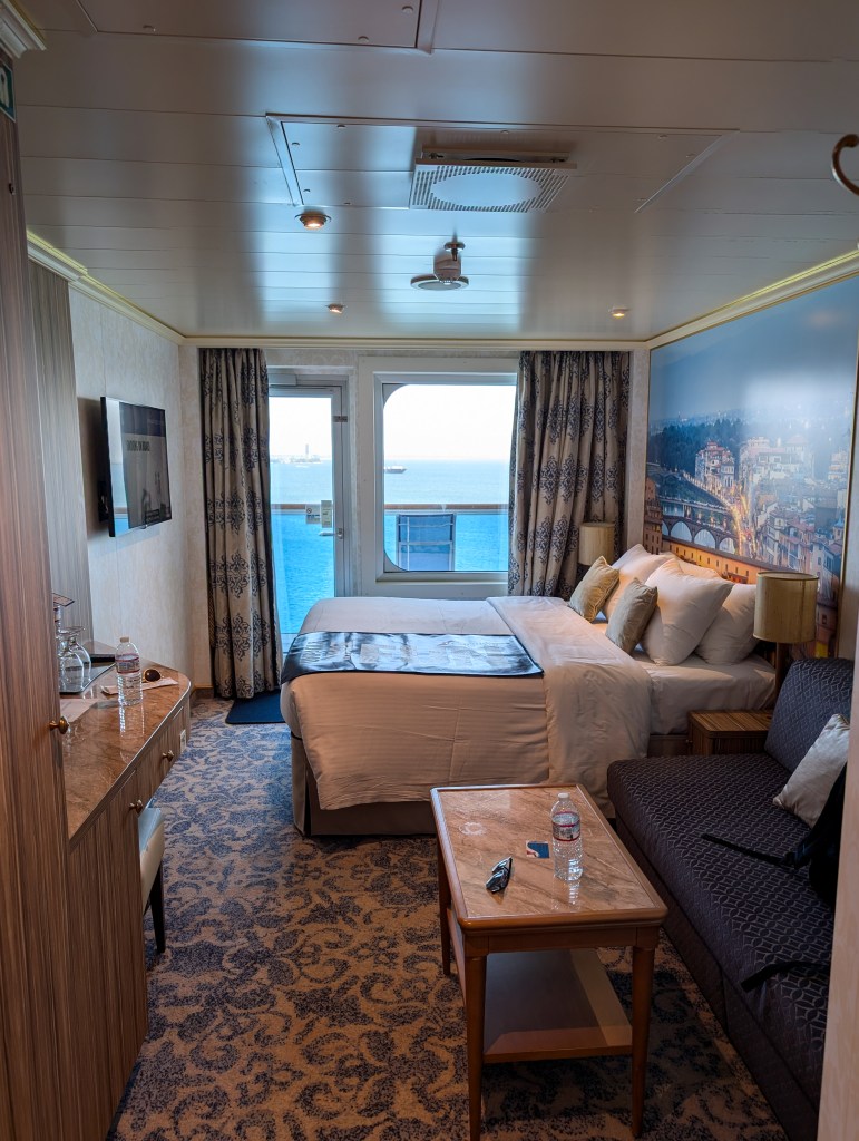 We stayed on floor 8 of 14 in a pretty central location, front-to-back speaking. It ended up being a great spot because we were pretty much equidistant to everything on the ship, and it was far enough away from the common spaces that our room was quiet. I was really quite impressed with how much our room felt like a normal hotel room—there was a TV, a couch, a mini fridge, a safe… It was smaller, sure, but it really didn’t feel that small. The biggest difference by far was in the bathroom. The bathroom did feel very small, particularly the shower. It wasn’t bad by any means, but I would say the bathrooms just generally were the least-nice part of cruising. I’m glad I never had to shave my legs on the cruise (thanks to my laser hair removal) because I overheard one woman saying she didn’t have enough room in the shower to do it. The shower only offered one liquid (bodywash and shampoo in one) so I’m really glad I decided to bring my own hair and body products, something I don’t normally do in a regular hotel.